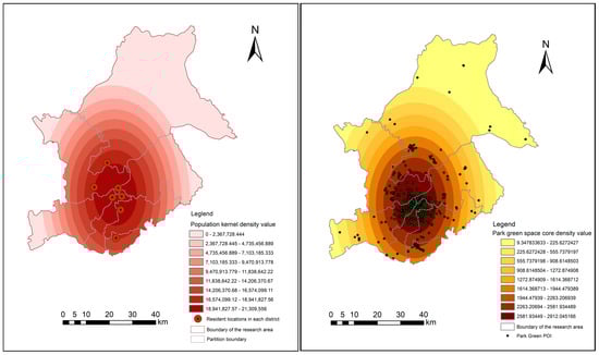 Based on the Kernel Density Analysis tool in the ArcGIS 10.8 software, KDE was carried out to analyze the population and parkland in the survey region (Figure 5). Based on the nuclear density analysis, it can be seen that the primary urban areas of Harbin, both in terms of population and parkland, are concentrated in the northwest of Hulan District, the southeast of Songbei District, the southwest of Daowai District, the northeast of Daoli District, the northeast of Nangang District, the northwest of Pingfang District, and the western part of Xiangfang District. The overall layout shows the distribution structure of clustering in the center of the main city and scattering in the surrounding undeveloped areas. From the seven main urban connecting areas to the periphery of the gradual decreasing trend, the overall view of the main urban parkland distribution is more in line with the structure of population development.