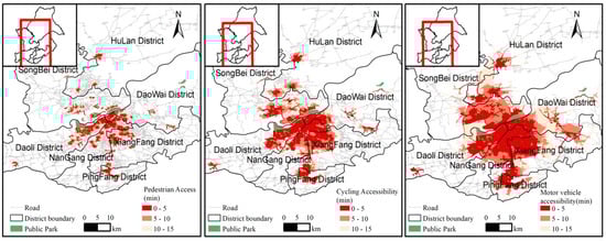 Based on the analysis of the accessibility of the study area, the specific conclusions are as follows: the study area of parkland is too small, and the proportion of the service region covered by parkland for a 15-min motor vehicle trip is only 16.37%. The overall distribution is also uneven, with clustering at the connections between the seven main urban centers and more sporadic spreading outward. The overall accessibility within the study area is average, with the three modes of travel varying significantly in accessibility, with motorized travel being the most accessible, cycling the next most accessible, and walking the least accessible. Although 96.57% of residents can enjoy the services of the parkland within 15 min of traveling by motor vehicle, based on the field survey, for most of the residents who currently go to the parkland for exercise or leisure after meals, the probability of walking is much greater than the probability of traveling by motor vehicle. However, on the contrary, walking represents only a tiny proportion of the residents who can enjoy the services of the parkland within 15 min. There are also significant differences in the accessibility of parks and green spaces in various administrative districts. The accessibility of parkland in Daoli and Daowai Districts is better. However, in the southwestern section of Nangang District, the eastern section of Xiangfang District, and the northern section of Hulan District, even if traveling by motor vehicle, reaching the parks and green spaces in less than 15 min is almost difficult. This results from the uneven distribution of park green spaces and a need for more geographical equity.