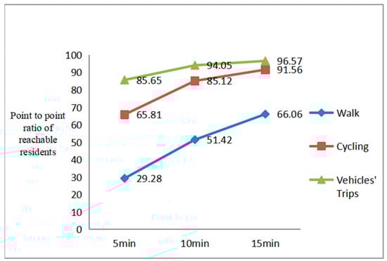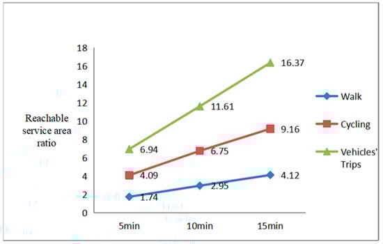 The number of accessible settlements can reflect the relationship between service facilities and neighboring residents and is an essential indicator of the standard of urban public service due to the uneven distribution of urban settlements [,]. Based on the results of the accessibility analysis map (Figure 6), the parks in the survey region are mainly scattered among the seven main urban areas of the connection area. Hence, the accessibility of these areas is better, and five minutes of cycling conditions can provide better coverage of the highest density of parks and greenspaces in the entire study area. Among the three different modes of transport, the accessibility of parkland for motorized vehicles was the best, with an area ratio of 16.37% under the 15-min condition for car travel. The accessibility for walking was the worst, and the increase in the area of the parkland was slower under the different time classes, with an area ratio of only 4.12% under the 15-min condition for walking (Table 3). As the travel time threshold increased, accessibility increased for all three modes, but the corresponding increases varied widely (Figure 7). In terms of the reachable area ratio, the walking and cycling modes increased more evenly and relatively gently at different travel time thresholds. The change in the motorized travel reachable area ratio was evident after 5 min, with a larger increase, which is a result of the more developed roadway network around the study area, resulting in a park service area that mostly coincides with the roadway network service area. In terms of the ratio of the number of reachable settlements (Figure 8, Table 4), the ratio of the number of reachable settlements in walking mode increased with time; the ratio of the number of reachable settlements in cycling and motor vehicle travel was 85.12% and 94.05%, respectively, at 10 min, which covers most of the settlements in the study area, and the increase in the ratio of the number of reachable settlements was much lower than that of 5 min. The reasons for this are as follows. Firstly, most of the settlements are covered by cycling and motor vehicles traveling at 10 min, and secondly, there are fewer settlements outside the reach of cycling and motor vehicles traveling at 5 min, and their distribution is not centralized.