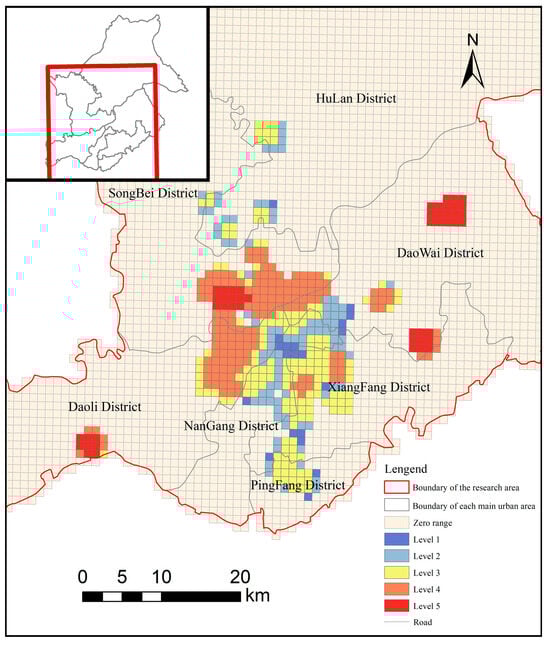 The supply in the calculation of the supply–demand matching degree of supply is the area of parkland in the primary urban area of Harbin City. According to crawling the Gaode map of Harbin City’s primary urban built-up area AOI, a total of 114 status quo parks and green spaces were extracted, with a green space area of 3020.85 hm2, which accounted for a proportion of the city’s built-up land of 0.65%, and an average per capita park green space area of 5.17 m2 (Figure 9). The demand in the calculation of the supply and demand matching degree of demand for the population density is the 2021 Harbin City residential built-up area population of 5,841,900 people. The model sets up one to four levels of supply and demand capacity: the higher the level, the stronger the supply and demand capacity.