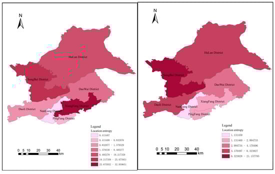 where LQj is the locational entropy of each region j, Tj is the total amount of parkland resources in each region j, Pj is the number of elderly disadvantaged groups in each region j, T is the total amount of parkland resources in the survey region, and P is the total population in the study area. A locational entropy > 1 indicates that the parkland resources per capita entitled to the disadvantaged groups in the district are greater than the overall level of the survey region scope, and the reverse is true if the locational entropy < 1.