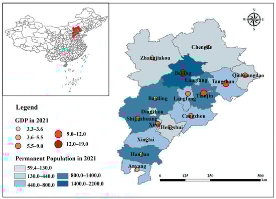 The BTH urban agglomeration is situated at the nexus connecting three major regions: North China, Northeast China, and East China, as shown in Figure 1. Covering an expansive 216,800 km2, it includes 16 cities, comprising the municipalities of Beijing and Tianjin, and 13 cities within Hebei Province: Zhangjiakou, Chengde, Qinhuangdao, Tangshan, Cangzhou, Hengshui, Langfang, Baoding, Shijiazhuang, Xingtai, Handan, Dingzhou, Xinji, and Anyang in Henan Province. As of 2021, the BTH urban agglomeration had a population of 113 million and a gross domestic product (GDP) of 96,356 million yuan, marking a 2.2-fold increase from 2014. However, cities within the BTH urban agglomeration exhibit significant spatial disparities in socioeconomic development levels []. Specifically, a notable economic gap existed between Beijing and Hebei in 2021, with Beijing’s GDP per capita soaring to 183,980 yuan, in stark contrast to Hebei’s meager 54,172 yuan.