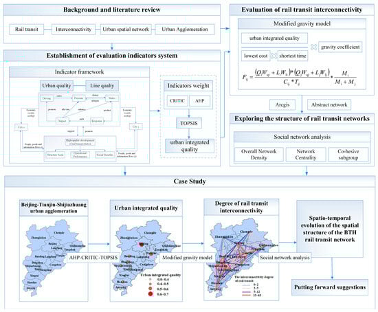 This study constructs a research framework that mainly includes the following aspects (Figure 2). First, clarifying the relationship among rail transit, interconnectivity, and urban agglomeration is the foundation to evaluate the interconnectivity of rail transit in the urban agglomeration. Second, establishing the indicator system in the aspects of urban quality and line quality to obtain the urban integrated quality, can reveal the complex mechanism of rail transit systems. Third, the gravity model is modified to evaluate the interconnectivity degree of rail transits in the urban agglomeration, demonstrating the urban attributes and visualizing the directional network. Fourth, the gravity matrix is used as the basic data for social network analysis to investigate the spatio-temporal impact of rail transit networks on the spatial structure in the urban agglomeration. Finally, based on the above, a case study of the BTH urban agglomeration is conducted and options proposed to improve the interconnectivity, polyneutrality, and tailored policies in the urban agglomeration development based on the evaluation results.
