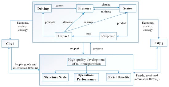 In the evaluation indicators of urban quality, the overall indicators need to form a logically closed loop under the DPSIR, reflecting the intrinsic mechanism of sustainable urban development oriented by rail transit []. The indicators of DPSIR are defined as follows: