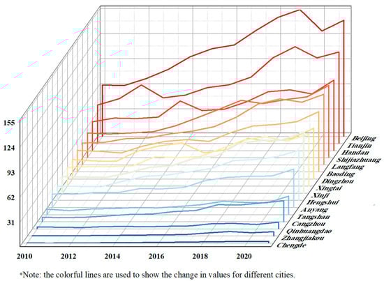 This study utilizes the panel data of the BTH urban agglomeration from 2010 to 2021 as the main data source for analysis. And the years 2010, 2014, 2018, and 2021 are selected as the cross-sectional data sources in the social network analysis. The study data are mainly obtained from the following sources: (1) To guarantee the scientific and accuracy of the data, most of the raw data come from the China Statistical Yearbook, China Urban Statistical Yearbook, China Transportation Statistical Yearbook, China Environmental Statistical Yearbook, Beijing Statistical Yearbook, Tianjin Statistical Yearbook, Hebei Statistical Yearbook, and Henan Statistical Yearbook for the years 2010–2021. (2) The map of the study area comes from the 1:1 million topographic databases of the National Geographic Information Resource Catalog Service System (NGIRCS). (3) Rail transit network data come from the Open Street Map. (4) Per capita carbon emission data come from the MEIC database. (5) The data on rail transit travel time and costs are primarily sourced from the China Railway Network: https://www.12306.cn/index/ (accessed on 21 October 2022) and other research collections. For the missing data, this study uses the linear interpolation method to supplement. The standardization of positive and negative indicators is selected to address the disparity in the nature and scale of indicators.