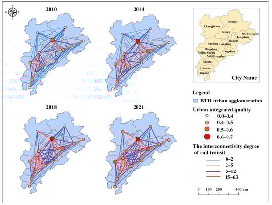 - The evolution of the relationship between rail transit interconnectivity and urban development. Data analysis uncovers a correlation between cities with high interconnectivity degrees and superior urban integrated quality. Cities with lower urban integrated qualities, such as Zhangjiakou, Chengde, Qinhuangdao, and Hengshui, show relatively weaker interconnectivity with non-core cities. This connection emphasizes the importance of simultaneously considering both transportation and urban development in urban planning and rail transit construction. These findings mirror those of Fang et al. [], who also observed a positive correlation between network spatial connectivity and the hierarchy of cities in the urban agglomeration. In the future, delving deeper into the mechanisms of this mutual relationship and exploring ways to better integrate them will be essential.