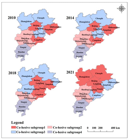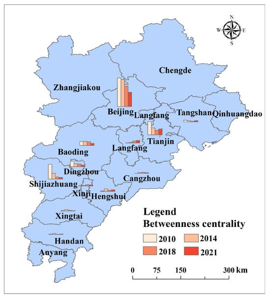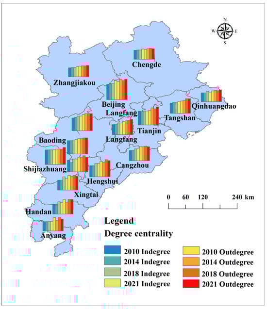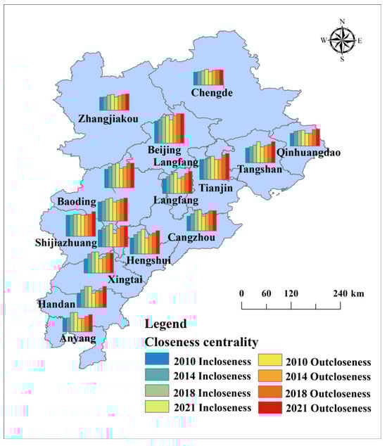 - From 2010 to 2021, the interconnectivity degree of rail transit in the BTH urban agglomeration experiences significant growth and shows a coordinated development trend. The total interconnectivity degree of the BTH urban agglomeration has risen by 82% from 2010 to 2021. The network density of the BTHRTN has consistently grown over the study period. Figures for incloseness and outcloseness are on the rise, while their disparity is decreasing. These findings suggest an overall increase in the interconnectivity degree of the BTHRTN, accompanied by a narrowing disparity between cities. The central region, led by Beijing, and the southern region, with Shijiazhuang as the focal point, are actively fostering synergy in the BTH urban agglomeration through two high-degree interconnectivity corridors: “Beijing-Tianjin-Longfang” and “Beijing-Baoding-Shijiazhuang”. These corridors will strengthen overall interconnectivity and promote coordinated development between the two regions. The emerging pattern of BTH-coordinated development is starting to manifest tangible results.