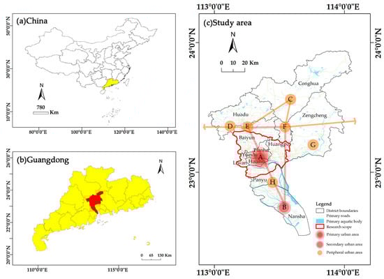 Figure 1. Study area: (a) map of China, (b) map of Guangdong, and (c) map of study area. The Guangzhou Master Plan (2017–2035): A, Guangzhou primary urban area; B, Nansha secondary urban area; C, Conghua urban area; D, Huadu urban area; E, airport’s economic area; F, known city area; G, Zengcheng urban area; H, southern city of Panyu.