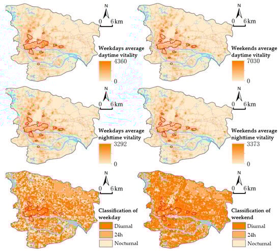In Guangzhou, urban vitality is primarily characterized by the combination of an “East–West Ridge + North–South Ridge” and “flattened polycentricity + peripheral microcenters” (Figure 4). The regions exhibiting significant liveliness are primarily located in the Tianhe and Yuexiu districts. Additionally, there is a notable concentration of vibrant places around the Airport Expressway, Panyu Avenue, and Guangzhou Avenue, which are also highly populated. High-vitality areas exhibit greater concentration during daytime and rest days compared to weekdays. Within commercial centers, high-vitality areas are scattered in a fragmented manner on weekdays, whereas on rest days they are primarily concentrated in specific locations such as the Tianhe and Haizhu districts. One possible explanation for this phenomenon is that during weekdays, a larger number of individuals go to work in the highly developed commercial districts, such as the Tianhe District. On their days off, they tend to reside in neighborhoods with more affordable housing options that are located at a specific distance from the city center. During weekdays, individuals like to spend their time in the city center. However, on their days off, they prefer to reside in residential neighborhoods that are located at a considerable distance from the city center. This choice is influenced by the more affordable housing rates in those places. This characteristic is also evident in the distribution of urban liveliness at nighttime on weekdays and weekends when commercial hubs exhibit reduced pedestrian activity at night and significantly increased spatial liveliness in their vicinity compared to daytime spatial liveliness on weekdays. Upon categorizing urban spatial vitality into daytime, all-day, and nighttime, it becomes evident that the majority of areas in the main urban region exhibit daytime vitality. Conversely, nighttime vitality is more likely to occur on weekdays and is more widely distributed compared to other days. The likelihood of experiencing all-day active and night-active urban-vitality types is higher on rest days compared to weekdays within commercial centers.