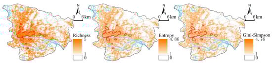 In the formula, i = richness, entropy, and Gini-Simpson;   π 1 ,     π 2   and   π 3 represent the probability of occurrence of daytime-active, all-day-active, and nighttime-active urban vitality, respectively.