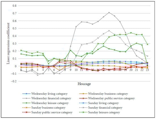 Figure 6. Variation of the linear regression coefficient of each business type and the pedestrian flows.