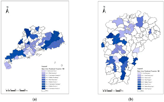 Furthermore, according to two consecutive annual rural household surveys of the Guangdong and Jiangxi Provinces in 2015 and 2016, the incidence rate of the rent-free farmland transfer was heterogeneous across the regions and related to the regional distributions of people who speak different dialects. Each area that speaks a dialect is not only a geographical region but also a cultural entity. Discrete rural villages are connected through a common language and integrated into a living community [7]. There are extensive studies on Chinese land transfer, only some of which have paid special attention to the regional culture and informal institutions involved, which will have an impact on the farmland market [8,9,10] and rural settlements [11].