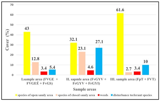 Among the study sites, the I. sample area had the lowest mean cover value. Examining all vegetation types of sample areas of the three locations together, the III. sample area, where military activity is still active, belongs mainly to the open grassland category (61.6%). At the same time, characteristic species of open sandy grassland were dominant in the I. and II. sample areas, too. The I. sample area had a quite high mean cover (43%), and it was followed by the II. sample areas with 32.1%. The closed grasslands of I. and II. sample areas were rich in species. The proportion of species of natural closed grassland was highest in the II. sample area (23.1%) but was quite high in the I. sample area (12.8%) as well.