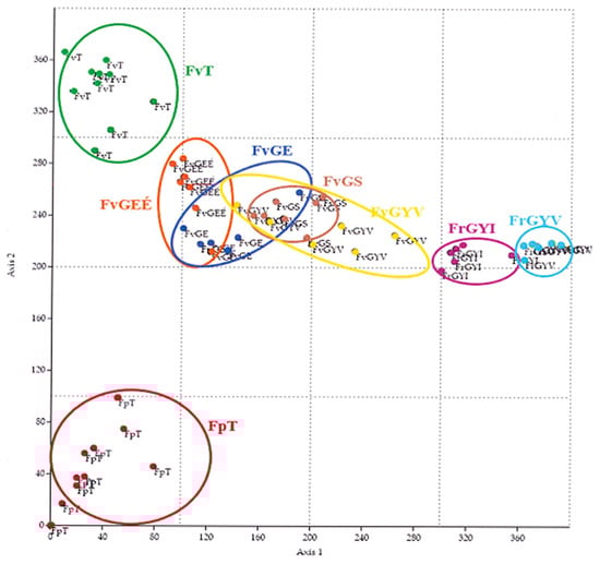 Based on the classification analysis of the Festucetum vaginatae vegetation types (Figure 5), the groups of records that belonged to each sample area were organized into individual clades. The clade of the Great Hungarian Plain area in Tatárszentgyörgy (FvT) was distinctly separated from the other studied locations. Based on the clade, the two sown grasslands (FvGYS and FvGI) were close to each other, and the two areas of the Little Hungarian Plain (Gönyű, Györszentiván) were not classified by geographical separation, but by management. The lowest difference between the quadrats was shown by the sown rampart of area 1 in Gönyű (FvGS).