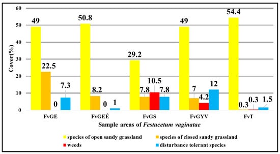 Focusing on the five areas with the vegetation type classification of Festucetum vaginatae association showed that the sown rampart of the I. sample area (FvGS) had the highest proportion of weed species with 10.5% (Figure 4). It was followed by the sown grassland of the II. sample area (FvGYV) with 4.2%. However, only a minimal mean cover value (0.3%) can be seen in the III. of weeds. The proportion of disturbance-tolerant species was high in the sown rampart of the I. sample area (7.8%) (FvGS) and in the original vegetation of the I. sample area (7.3%) (FvGE), but the highest mean cover value (12%) was in the sown grassland of the II. sample area (FvGYV). The number of species that belonged to the open grassland category was generally high, around 50%, except for the vegetation type of the sown rampart of the I. sample area (29.2%) (FvGS), and it was highest in the III. sample area, where military activities are still active (54.4%). In terms of species of closed grassland, the richest were the original vegetation of the I. sample area (22.5%). It was followed by the burnt grassland of the I. sample area with 8.2% (FvGEÉ), and then the sown rampart of the I. sample area (FvGS) with 7.8%. The sown grassland of the II. sample area (FvGYV) had a lower cover value in terms of the characteristic species of closed grassland (7%), but the III. sample area (FvT) had almost no species that are characteristic of closed grasslands (0.3%).