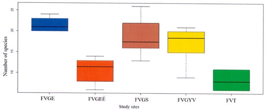 According to the recorded data of the Festucetum vaginatae vegetation type, the vegetation of Tatárszentgyörgy (III. sample area) was distinguishable from the other sample areas (Figure 2, Figure 3 and Figure 4). The highest average number of species was found among the records of natural grassland at 23. The average number of species in the burnt area (FVGEÉ) was significantly lower at 12, and the average number of species of the III. sample area in Tatárszentgyörgy (FvT) was the lowest at 7, whereas the number of species in the manually sown rampart (FvGS) in Gönyű was 22. Similarly, the number of species in the sown grassland (FvGYV) of the II. sample area in Győrszentiván was lower at 15 (Figure 6).