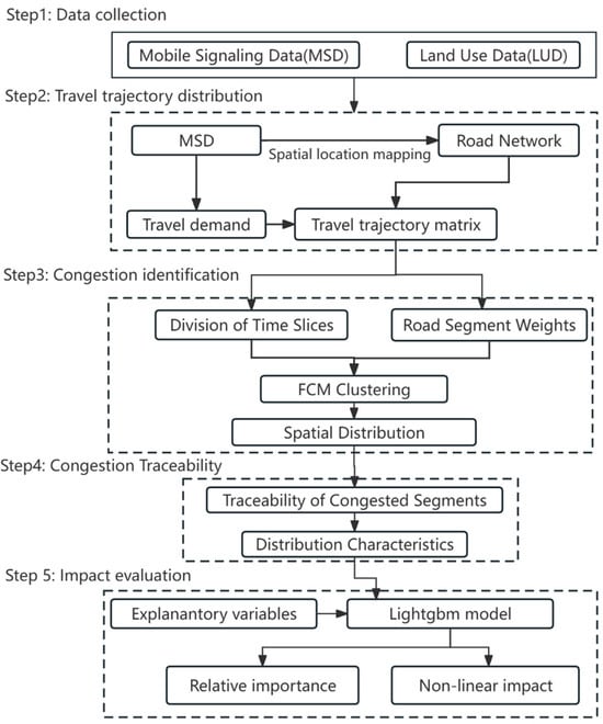 Figure 2 presents an analytical framework for investigating the distribution characteristics and influencing factors of congestion sources. Initially, mobile phone signaling data was mapped onto the road network to construct travel trajectory matrices. Subsequently, the data underwent time-slice processing to calculate the undirected weight values of roads in each time slice. The Fuzzy C-Means (FCM) clustering method was then applied to identify congested sections on expressways, main roads, and secondary roads. Following this, the origins of congested sections were traced to analyze the distribution characteristics of different source plots. Lastly, the LightGBM method was employed to study the impact of various factors on congestion contribution, revealing the non-linear relationships between these factors and congestion contribution.