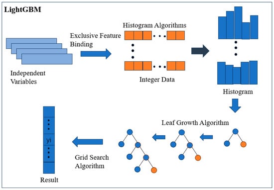 LightGBM is an advanced iterative decision tree algorithm, exhibiting significant advantages in efficiency and space usage compared to traditional models like GBDT. This is primarily attributed to its integration of two innovative technologies: Gradient-based One-Side Sampling (GOSS) and Exclusive Feature Bundling (EFB). GOSS significantly reduces computational load by retaining samples with larger gradient values while randomly sampling those with smaller gradients, thus enhancing the model’s efficiency. On the other hand, EFB, leveraging the sparsity of high-dimensional data, combines exclusive features, ensuring both the integrity of information and a reduction in feature dimensions. Additionally, LightGBM employs a histogram-based strategy for node splitting in decision trees, effectively identifying and splitting features that offer the maximum information gain. It also utilizes a leaf-wise growth strategy with depth limitations, which not only ensures efficiency but also effectively prevents overfitting by choosing the leaf with the maximum splitting gain for splitting. The structure and main experimental procedure of the LightGBM model are elaborately illustrated in Figure 2. This algorithm excels in handling large-scale datasets, particularly suitable for machine learning tasks that demand high efficiency and accuracy. The structural details and primary experimental flow of the LightGBM model are depicted in Figure 3.