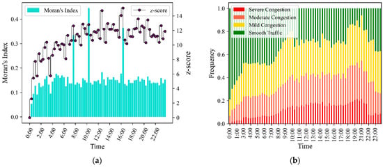 The spatial distribution and frequency characteristics of congestion status at different times were further analyzed, as shown in Figure 4. Figure 4a reveals the spatial autocorrelation numbers for each time node, with a time granularity of 20 min. The study utilized the Fuzzy C-Means (FCM) method to ascertain that the traffic congestion status within Xi’an’s third ring road is fundamentally correlated with space and exhibits a positive correlation throughout the day. Specifically, during the morning rush hour, the spatial distribution exhibits the highest degree of clustering and the highest level of congestion, with the peak Moran’s index observed at 10:00 a.m. This phenomenon suggests that targeted congestion management strategies during these peak hours could be highly effective, especially in clustered areas where congestion is most pronounced. As time progresses, the correlation between congestion intensity and spatial distribution remains stable, with certain clustering characteristics in the spatial distribution. Figure 4b illustrates the frequency of occurrence for each congestion level, using a 24-h daily granularity. From 0:00 to 6:00 a.m., the traffic network is at a low due to the rest period, with fewer residents traveling and the congestion level generally remaining unimpeded. Starting from 7:00 a.m., with the onset of the morning rush hour, the frequency of unimpeded road sections gradually decreases, and the level of congestion progressively increases, peaking around 10:00 a.m. Post noon, the congestion status undergoes slow changes until 18:00, when the congestion trend starts to intensify significantly, reaching its peak around 21:00. The sharp increase in congestion in the evening highlights the necessity for efficient public transit systems and real-time traffic management. The observed pattern of congestion intensification and subsequent easing further underscores the need for dynamic congestion management systems that can adapt to changing traffic conditions throughout the day.