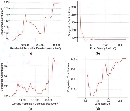 Figure 6d demonstrates the relationship between land use mix and congestion contribution, overall displaying a V-shaped pattern. Specifically, the congestion contribution sharply declines in a near-linear fashion within the land-use mix range of about 1.6–1.7. Beyond 1.73, the congestion contribution significantly increases, peaking around 1.9. However, the congestion contribution rises again beyond a land-use mix of two. Given the continuous increase thereafter, caution should be exercised with land-use mixes above 1.8.