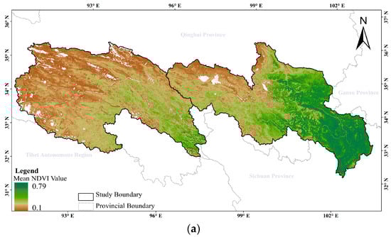 From the spatial distribution of the multiyear mean NDVI in the SRYYRs (Figure 9a), it is evident that a gradual decrease in the mean annual NDVI of vegetation occurs from the southeast towards the northwest. Specifically, the low values are mainly located in the source region of the Yangtze River and the northwest of the source region of the Yellow River. Conversely, higher NDVI values are predominantly observed in the eastern section of the Yellow River source region. When comparing the mean annual NDVI averages between the two river source regions, it is noteworthy that the Yellow River source region exhibits a mean annual NDVI of approximately 0.12 units higher than that of the Yangtze River source region. This substantial difference indicates a significantly better vegetation cover in the Yellow River source region. Regarding the interannual trend of vegetation change, the overall quality of the SRYYRs develops a positive trend, and the quality of the vegetation in the southeast of the source region of the Yangtze decreases significantly. However, it is noteworthy that the vegetation quality in the southeastern portion of the Yangtze River source region experiences a significant decline (Figure 9b). Furthermore, the interannual trend of the NDVI change in both regions follows a similar pattern. However, the fluctuation in the vegetation cover in the source region of the Yellow River is significantly higher than in the Yangtze River source region (Figure 9b).