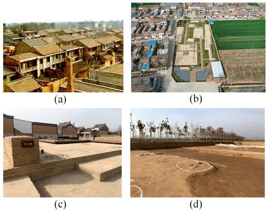 Actual view of the Zhouyuan site. (a) Townships near the Zhouyuan site in the mid-1980s. (b) Townships near the Zhouyuan site at present. (c) Ruins adjacent to the villages at present. (d) Archaeological work in progress at the Zhouyuan site.