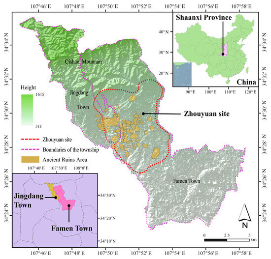 However, less research has involved the development of townships near the ancient large city-sites areas with paramount conservation significance. The authors visited many ancient large city-sites areas, such as the Erlitou site and the Yinxu site in Henan Province, and the Zhouyuan site, the Terracotta Warriors and Horses site, and the Han Chang’an City site in Shaanxi Province. Although there are differences in the natural endowments and social and economic conditions of the areas, the townships around the sites are generally developing rather slowly. Therefore, it is possible that the strict heritage protection policy is an important constraint on the rapid development of these townships. Thus, it is valuable to probe the relationship between township development and relics conservation in the ancient large city-sites areas. In this paper, we selected the Jingdang and Famen towns near the Zhouyuan site as the case studies to explore the evolution of township development in the ancient large city-sites areas, which has experienced a long-term strict heritage conservation regime. In contrast to the traditional qualitative studies that rely on empirical and descriptive methods, this paper quantitatively reveals this area’s spatial–temporal evolution based on remote sensing data and demographic data using a combination of three methods, including land use classification, land use transfer matrix, and landscape pattern center of gravity changes, to seek a solution for a harmonious development between the townships and heritage conservation in an area rich in ancient cultural relics [16]. Taking the Zhouyuan site as an example, this paper aims to explore the development of the townships around the Zhouyuan site over the past 40 years through quantitative research methods. And based on this, it discusses the conflict between the protection of ancient large city-sites areas and the development of its neighboring townships, and proposes more practical suggestions to reconcile the relationship between township development and heritage conservation.