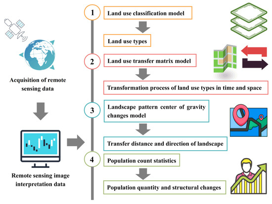 The research methodology can be divided into four steps (Figure 3): (1) The remote sensing data of different years were classified into six types of land use through the land use classification method. (2) The land use transfer matrix model was established to analyze the spatiotemporal transition process between different land use types [37]. (3) The change model of landscape pattern gravity center was constructed to analyze the transfer distance and direction of various landscapes. (4) Demographic data were used to analyze the population quantity and structural changes in the study area.