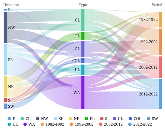 Among the six types of land use, the gravity center of CL changed the most frequently in distance, moving 2184.41 m to the northwest from 1992 to 2002 and 1357.09 m to the northwest from 2012 to 2022. The net decrease in CL was the fastest in these two periods. The distance change of the gravity center of COL was the most stable among all land use types over the 40 years, reflecting that the increase in COL may be mainly the continuous expansion centered on the original village, with little large-scale new land for residential or other construction lands. Meanwhile, the gravity center of FL, GL, and WA has also changed significantly. Over the past 40 years, FL has degraded toward the northeastern mountains, with a cumulative distance of 1,508.68 m. Although the gravity center of GL oscillated from north to south, it also generally degraded to the northern mountains, with a cumulative distance of 780.72 m. The most dramatic phase of the gravity center change in WA occurred in 2012–2022, moving 3560.78 m to the southeast. Among them, the gravity centers of GL and WA have been moving southward in the last decade.