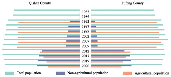 Population structure of Qishan and Fufeng counties from 1985 to 2020.