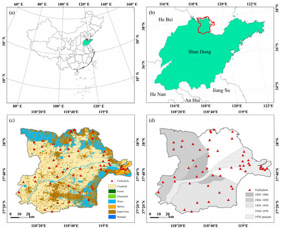 Location and field plots distribution of the study area. (a) Map of China; (b) Location map of the Yellow River Delta in Shandong; (c) Land cover map of the Yellow River Delta; (d) Soil formation time map of Yellow River Delta.