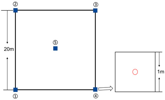 Distribution of five 1 m × 1 m quadrats in a 20 m × 20 m plot. (After setting the plot, the first quadrat was set from the southwest corner of the plot, the second to fourth quadrat records were set in a clockwise direction, and the fifth quadrat was set at the center point of the plot. The red circles represent the center of each quadrat.)
