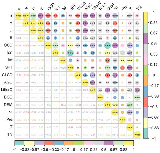 Spearman analysis of plant diversity index and influencing variables in the Yellow River Delta. (s—species richness; H—Shannon–Wiener index; D—Simpson index; E—Pielou’s evenness index; OCD—0–5 cm soil organic carbon density; lon—longitude; lat—latitude; SFT—soil formation time; CLCD—Annual China Land Cover; AGC—above-ground carbon; BGC—below-ground carbon; DEM—digital elevation model; SI—salinity index; Pre—precipitation; T—temperature; TN—total nitrogen content; * indicates p < 0.05; ** indicates p < 0.01; *** indicates p < 0.001).