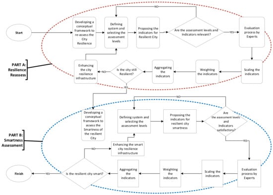 The proposed framework aims to measure the smartness of a resilient city. Given the continuous expansion of cities and the ongoing evolution of technology, a city previously deemed resilient may no longer meet current resilience standards. Therefore, before assessing the smartness of a resilient city, it is essential to re-evaluate its resilience. The framework comprises two phases: Part A involves reassessing the city’s resilience, while Part B focuses on evaluating the smartness of the resilient city. Each section follows a structured approach, including the following steps: