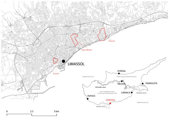 Geographical location of Limassol and case study neighborhoods (from west to east: Arnaout, Agios Nikolaos, Dasoudi). Source: the authors. Base map: Bing Maps Satellite Imagery; Inset of Cyprus: adapted from CIA 2010 [41] (Public Domain).