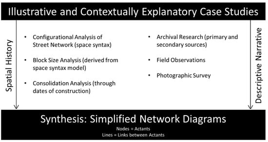 The mixed methodology used for the analysis includes the following: (a) a ‘spatial history’ of the neighborhoods through the mapping of building construction data, space syntax analysis and block size analysis; (b) the construction of a descriptive narrative elaborating on the spatial analyses through archival research of press articles, conversations with three local experts, a researcher’s observations and a photographic survey of the sites; and (c) the synthesis of physical and human components, the agencies involved in their development, and their interrelationships in simplified network diagrams. The methodology is summarized in Figure 2, and the methods are explained in more detail below.