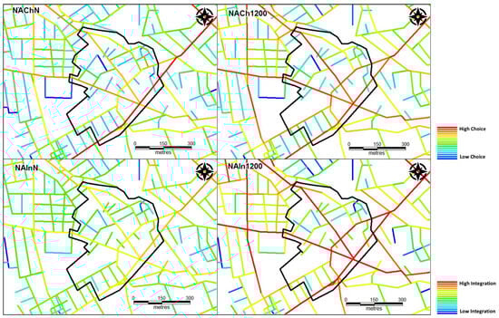 Space syntax3 quantitatively describes patterns of spatial layouts by analyzing properties of the street network, such as betweenness (NACh—normalized angular choice) and closeness (NAIn—normalized integration). Betweenness calculates the number of shortest routes passing through a street segment between any two points in the system, reflecting the likelihood of passing movement on the streets. Closeness calculates the relative accessibility of street segments (how close each segment is to all others in terms of the sum of angular changes that are made on each route [44]) within the spatial system, reflecting the likelihood of a street segment to act as an ‘easy-to-reach’ destination. Measures can be calculated at any scale; for instance, the city-wide scale considering all streets within the city, or local scales considering all streets within a given radius4.