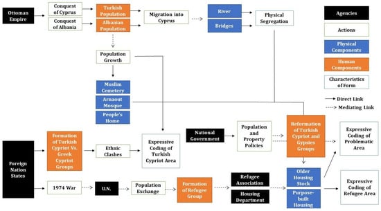 The agents identified in the process of the emergence of the neighborhoods and their transformation, such as their urban form and expressive characteristics, range from empires and national governments, international organizations, population groups, and local associations to small-scale material elements such as rivers, bridges, and roads. More specifically, the agency is reflected and highlighted in related demographic changes, the influx of internal and external migrant populations from differing socio-economic backgrounds, cultural identities, and housing typologies. In complex cases like the urban environment, an extensive list of all agents, actors, and components, or details about every potential capacity, would neither be possible nor valuable. Still, a greater understanding of this complexity is possible by exploring and visualizing how different components are linked together and how their capacities, as well as their actions and mediating roles, lead to the emergence of form. The diagrams do not depict a specific state of affairs highlighting permanence or even a temporal sequence of events and development, but rather a process ensuing from the interaction between human and non-human actors, from the agency exerted by national governments and international affairs and by specific small-scale physical elements of the urban fabric. The view provided by the diagrams emphasizes the neighborhood as a “contingent, fragmentary, heterogeneous but persistent product of human and non-human actors, intermediary and mediator roles, concrete associations, stabilizing and destabilizing agencies, and urban assemblages” [27] (p. 155).