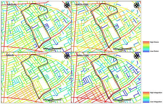These findings challenge the assumption that geographical location alone determines an area’s integration within the city. They emphasize that the presence of a single highly used long-range route does not significantly impact overall accessibility values. Instead, the presence of multiple routes with high accessibility values, especially if they cross the areas rather than just bordering them, plays a more pivotal role in determining average choice and integration values.