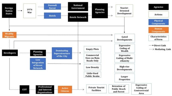 After conducting these analyses and drawing inferences, simplified network diagrams were constructed for each neighborhood to represent the interplay between various agencies. In these diagrams, nodes represent actants—anything that has agency in the neighborhood—as follows: an actor, physical or human, but also the resulting characteristics of the urban form, which, in turn, exert influence and contribute to the definition of the identity of a neighborhood. The lines connecting the nodes represent the links between the actants; these are defined as direct links when the ‘cause–effect’ influence is not immediately intervened upon by another agency or as a mediating link when another agency does intervene. For the purposes of this research, the networks are complete once all the agencies defining the key contemporary characteristics and, consequently, the identity of the neighborhoods, as observed in the analysis, appear in the diagram.