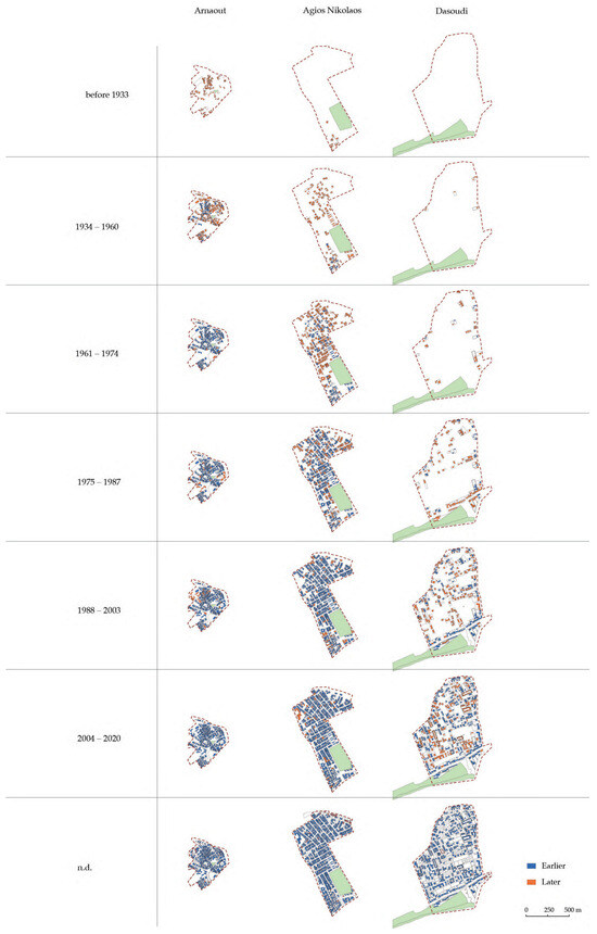 | 5 | The data presented certain challenges. Approximately 5–10% of the building information had gaps, with a notably higher rate in the case of Arnaout. To address these gaps, the authors manually filled in missing data, often relying on assumptions drawn from historical maps for construction dates. These same historical maps were used for the diachronic space syntax analysis of the whole city in a broader study [38], providing the contextual information for the present research. |