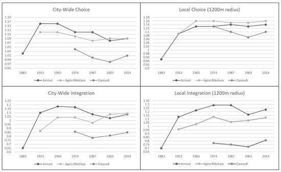 Looking specifically at contemporary values, Arnaout and Agios Nikolaos exhibit somewhat similar values, with the former having stronger local values, especially for integration. These values reflect the observations of space use activities well, as Arnaout displays higher levels of movement and static activities on its most integrated streets, while Dasoudi shows almost no activity, potentially reinforced by its low population density.