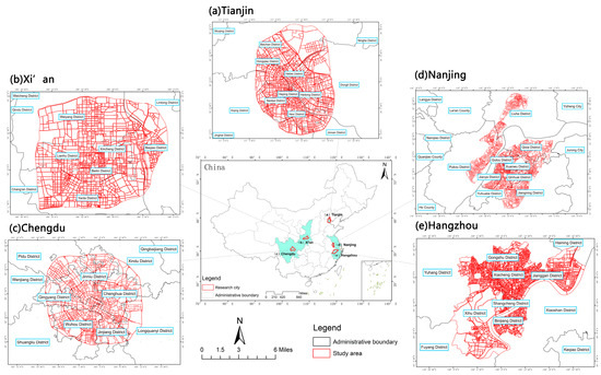 The research areas are the central urban areas within the ring highways of Chengdu, Nanjing, Hangzhou, Xi’an, and Tianjin (Figure 1). These five cities have outstanding performance in terms of GDP (gross domestic product), number of permanent residents, concentration of commercial resources, and urban hub, all of which are extremely strong new first-tier cities. The selected central urban area concentrates most of the city’s construction land and permanent population, making it a key area for urban planning and construction. And the urban functional distribution within this area is concentrated, with high spatial heterogeneity and suitable block scale, making it an ideal area for identifying and analyzing the current urban land use functions.