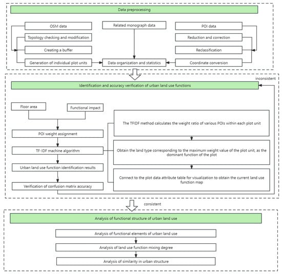 This study uses OSM (OpenStreetMap) data as the base map of the study area, which is an open-source world map that can be freely edited by Internet users. Users can access and download data for free through an open license agreement (www.openstreetmap.org). This study uses POI data from Amap (https://lbs.amap.com), which was crawled on its API platform in December 2022 to ensure that the POI data utilized in this research is highly current. The total number of raw POI data for the five cities reached more than 1,735,000 items. And the land use status of the five cities on the Gaode satellite map was referenced as the real value to construct the confusion matrix to test the precision of identifying urban functions. The technical pathway is illustrated in Figure 2.