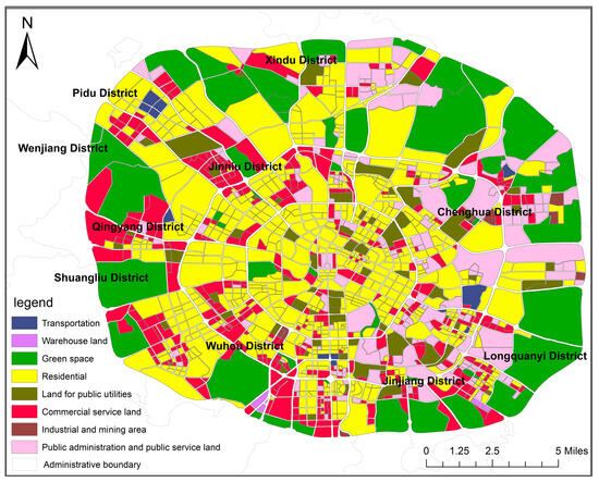 The study area of Chengdu City has a significant proportion of residential, green space, commercial service land, and public administration and public service land use in the study area of Chengdu City (Figure 3). Further observation of the first four types of land use reveals that residential is mostly distributed in the Jinniu, Wuhou, and Qingyang districts. Public management and public service land is concentrated in Chenghua District and Jinjiang District. Commercial service land is concentrated in Qingyang District, Wuhou District, and Jinjiang District. Green space is distributed in all administrative districts and is concentrated in the outermost part of the study area.