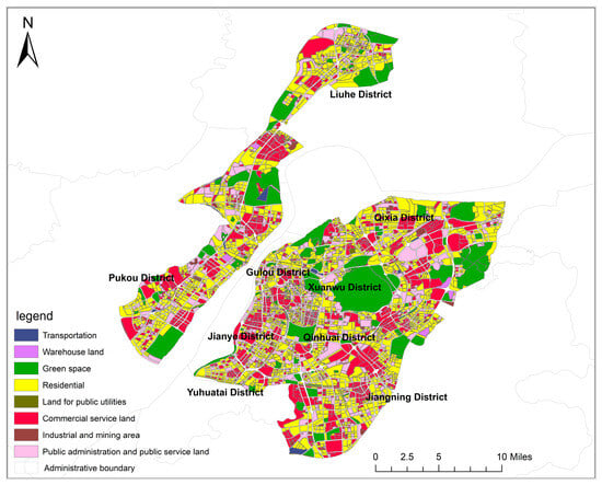 As depicted in Figure 4, residential land is the most prevalent land type in the study area of Nanjing, evenly dispersed across all districts. Upon closer examination, it becomes apparent that, akin to commercial service land, residential, public management, and public service land are distributed across all administrative districts, while green space is primarily concentrated in Xuanwu District, Qixia District, and Pukou District.