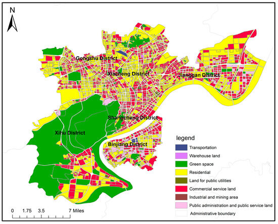 As can be seen from Figure 5, residential land and green space occupy most of the study area in Hangzhou. In addition, most of the green space, represented by Hangzhou West Lake Scenic Spot, Wuchao Mountain National Forest Park, and Xixi National Wetland Park, is concentrated in the West Lake district, while residential land and commercial service land are concentrated in Gongshu District, Shangcheng District, and Binjiang District.