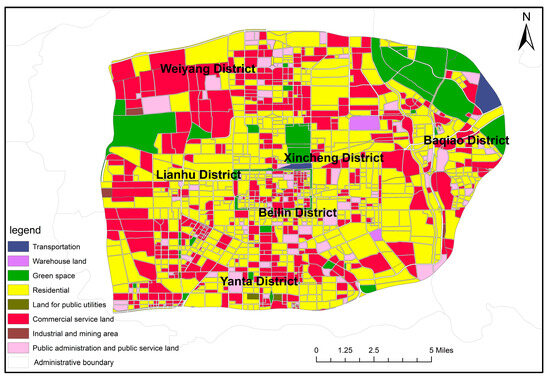 Figure 6 shows that residential land occupies most of the land in the center of Xi’an. Further observation reveals that residential land, commercial service land, and public administration and public service land are distributed in each administrative district, while green space is mainly distributed in Weiyang District, Lianhu District, Beilin District, and Baqiao District.