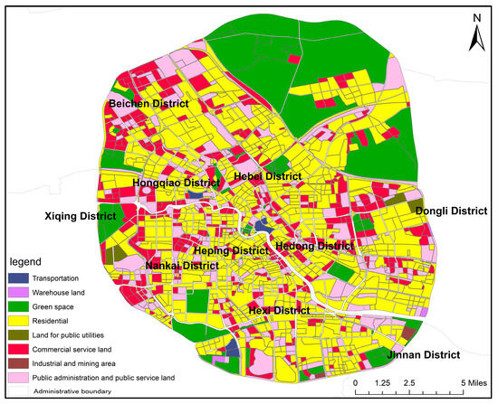 As can be seen from Figure 7, residential land occupies most of downtown Tianjin. Meanwhile, residential land, commercial service land, and public management and public service land are more evenly distributed, while green space is mostly distributed in Dongli District, Nankai District, and Beichen District and concentrated at the edges of the study area. Meanwhile, the number of internal areas is relatively small.