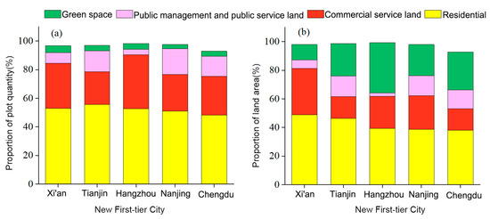 Number and size of land parcels for major land use functions in new first-tier cities. Note: (a) represents the proportion of land parcels with main land use functions in new first-tier cities; (b) represents the proportion of land area for the main land use functions in new first-tier cities.